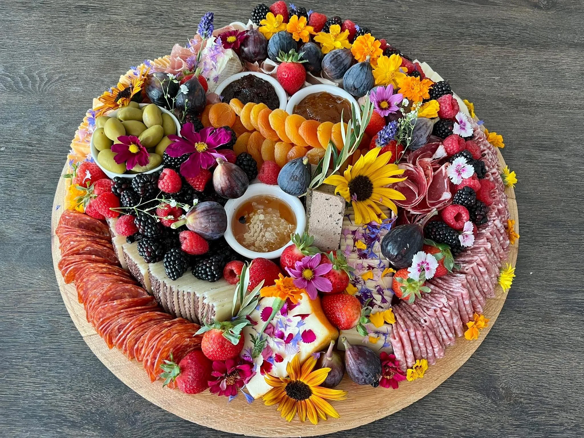 Wine barrel heads and Large round charcuterie boards made custom for your quantity. Includes a fine quality luxurious spread of cheeses as well as cured meats, honeycomb, dried fruit, olives and nuts. Served with fresh baguette and crostini.